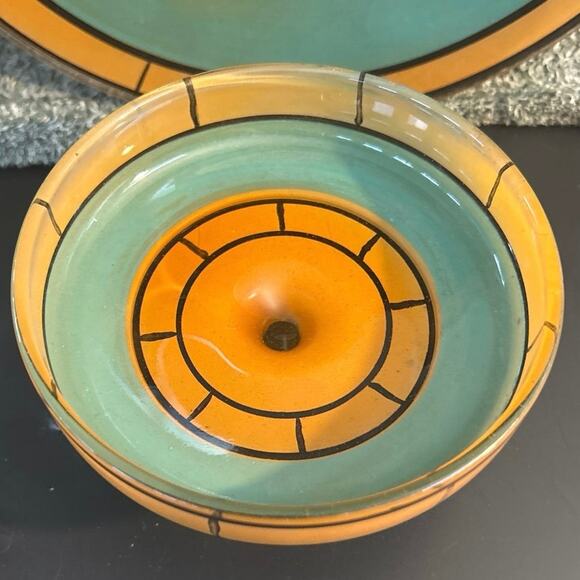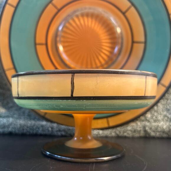 This piece is reverse hand painted, in exceptional Art Deco style with brightly contrasting colors, reminiscent of Clarice Cliff.