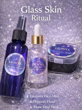 Three-step glow kit for hydrated, luminous skin. Tsunami face mist refreshes and soothes. Phoenix fluid adds pearlescent radiance. Moor mud mask purifies and refines pores. Lightweight, everyday formulas.