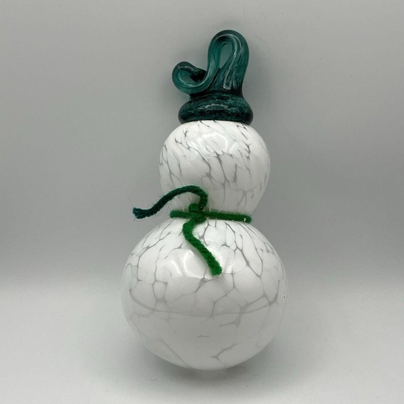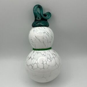 Glass Snowman Handblown Ornament Sculpture White Marbled / Emerald Hat Christmas / #1
