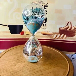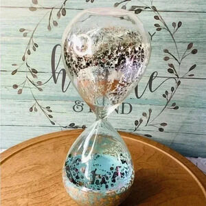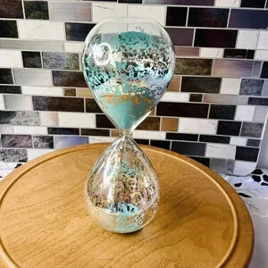 Glass Speckled Hour Glass with Turquoise Sand 8.5”tall 3” wide