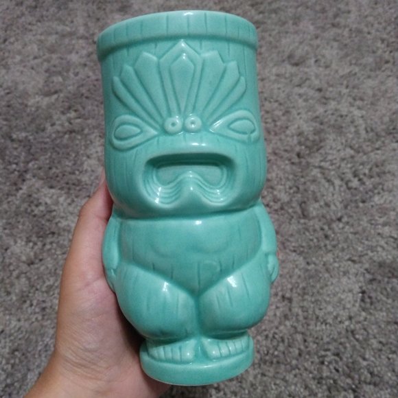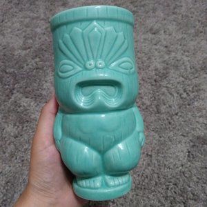 A small glass cup in the shape of a tiki. It's not very deep, perhaps it could be used as a shot glass, or a candle holder, or a small vase...? I used him as a decorative piece. It's in perfect condition, no chips or cracks. Will you give him a new home?