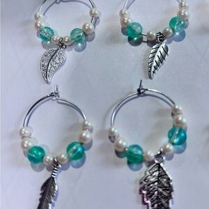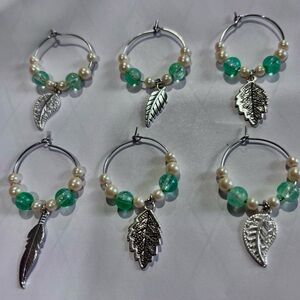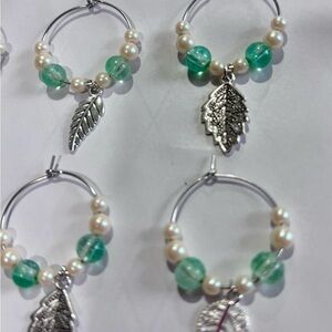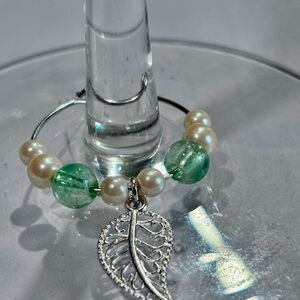 Elegant silver wine glass charms featuring green beads and leaf charms. Perfect for adding a touch of nature-inspired beauty