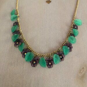 features vivid green glass leaves and purple enamel flower charms with rhinestones in the center