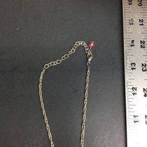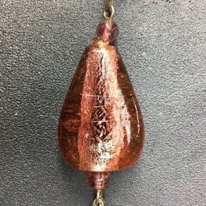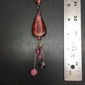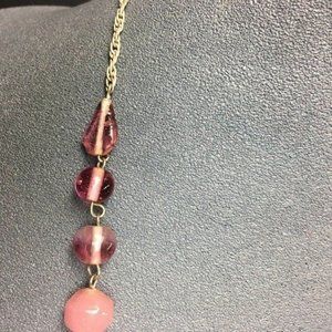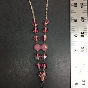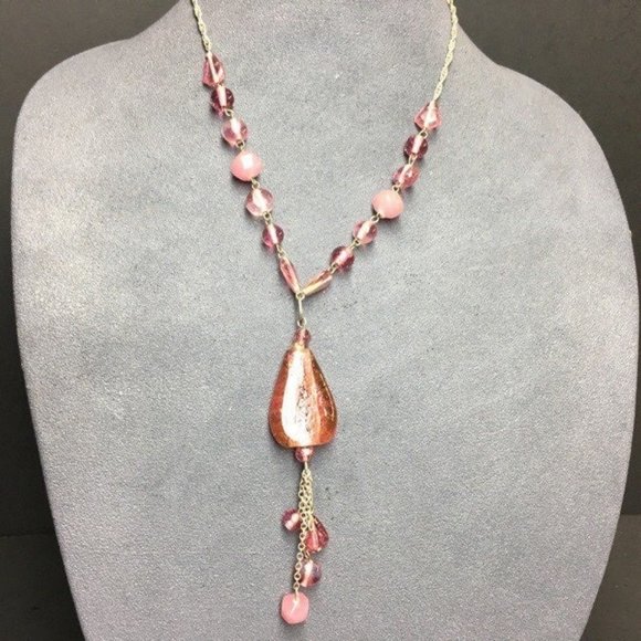 Glass Y Drop Necklace Pink Pendant Iridescent Silver Chain Dangles Twisted Rope
