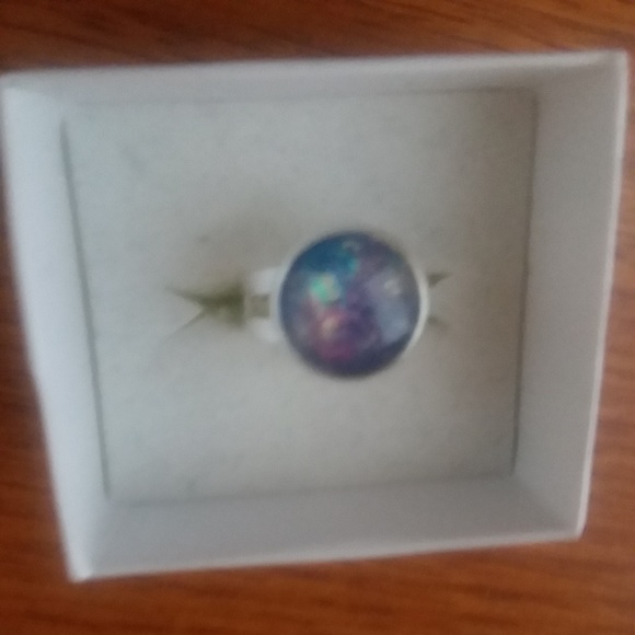 Very pretty, different looking silver plated glass cabochon - adjustable, very sturdy setting