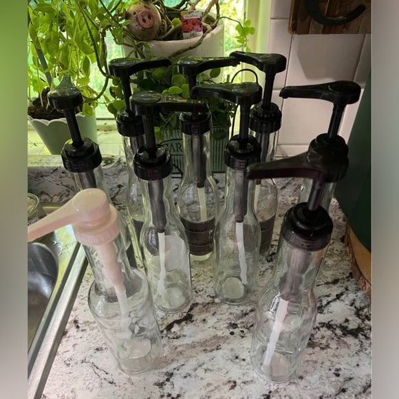 Only used one time then switched to flavored cups. Can be use to hold any liquid. Used for coffee flavoring syrups. Some have some labels on them. They are all glass