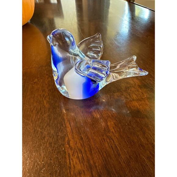 About 4” by 3” beautiful glass bird. Clear with white and cobalt blue on inside.