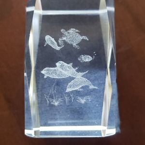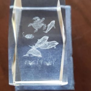 Glass cube etched ocean scenery. Dimensions are 1 and 11/16" in height and thickness is 1 and 1/4. Comes with gift box