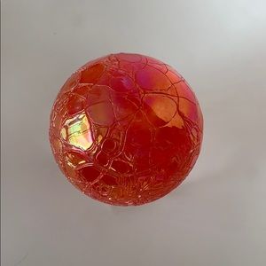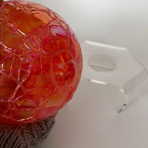 Anton Intaglio warm orange/metallic glass ball with clear 3 legged stand. 4” round glass sphere sits 5.5” high on stand. Textured like detail on sphere contrasts nicely against smooth clear stand. Slight discoloration on bottom, unseen when on stand. Overall great condition.