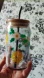 Glass drinking cup with bamboo lid and metal straw, decorated with lemons and flowers