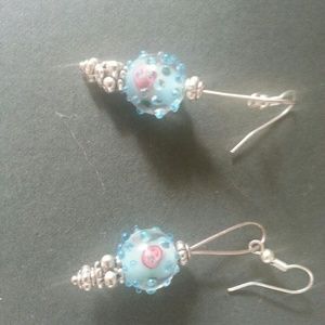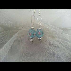 Light blue with little pink roses inside and little blue bubbles on the outside of the earing nicely accented with silver decoration on the bottom and top. Perfect for a casual wear or a vintage look .