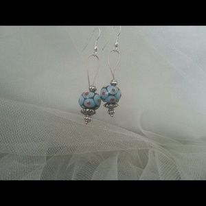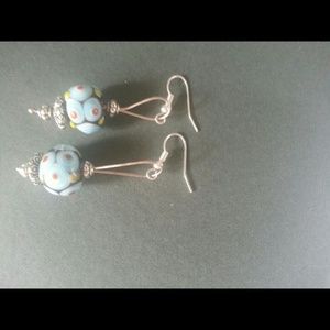 Black bead , white filled circles with a light blue swirl on top accented with a nice red orange and greenish yellow . Beautiful pair of earings for a nice summer outfit on a relaxing summer vacation.