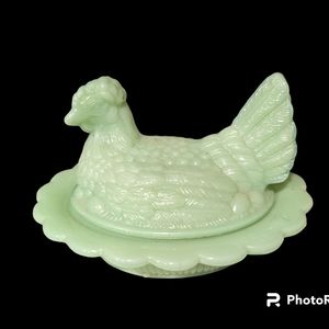 vintage-style glass items. Four piece total. two hens. Two nest. Jade Green