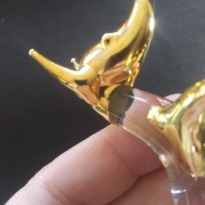 Glass kangaroo with a baby joey in the pouch clear glass with gold accents ( the gold is just gold paint not real gold no indicators that real gold was used) . ~ 3.25" tall of adorableness of the gold joey in the pouch just made me fall in love with this figurine. Ruler in pic to help with size visualization. Only flaws that I can find seems to some gold worn off or scracthed off at the neck of the mommy kangaroo see last three pictures for a close up. Could have been a manufacture's error as well I never noticed it before until I started taking pictures. Questions are always welcome