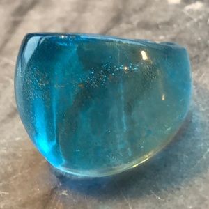 Glass ring in size 7.5. Colors are predominantly blue with a touch of gold layered within.