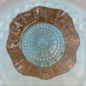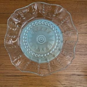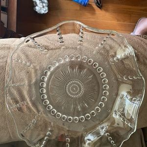 Glass serving dish with wavy sides. I have had this piece and I don’t use it. The dish is a great serving piece, can be used in a formal or holiday table. Goes with every type of dish or table setting. It is time for someone to use it.