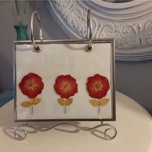 Beautiful piece! Pretty coral colored pressed flowers stand between a glass frame. This could be used for pictures or recipes. Holds 60 total 4 x 6 pictures. Total easel is 8 inches tall by 7 inches wide.