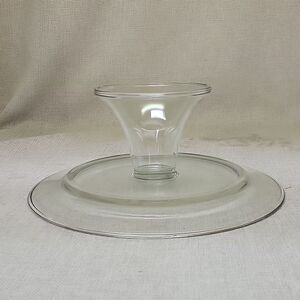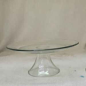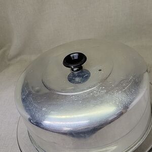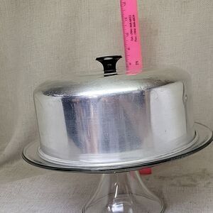 A nice combo to display and keep your cake. The glass platter is 9 1/2" wide and 4 1/2" tall. The aluminum top is 9 " wide and 3 3/4" without the knob. They are not a set but go together nicely.