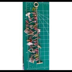 Beautiful charm laden bracelet with multiple glass butterfly beads, tiny yellow fish snd multiple shapes of beads, approximately 7.5” long. Very good vintage condition.