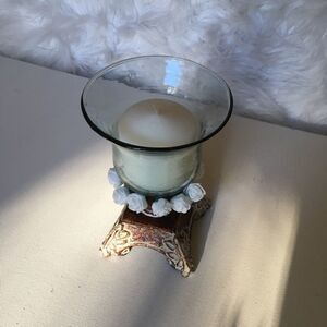 Glass candle holder sitting on a rustic look pedestal decorated with small white flowers.