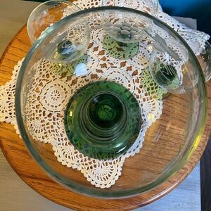 I’m not really sure what the extra large glasses for it is a Vintage item so this set includes four pieces, the three little wine glasses, and then the extra large wine glass. Maybe someone can tell me what it was used for.