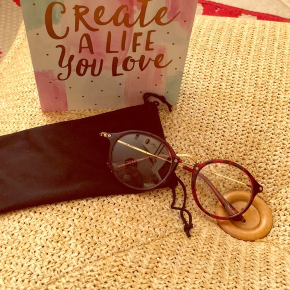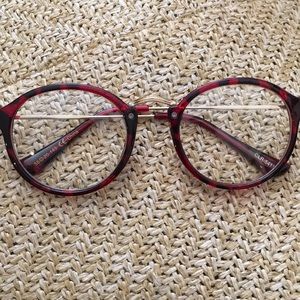 these do not have a perscription. they are clear but can have a perscription put in them. the frames have gold arms and gold nose piece with black and red details circling the eyes and at the end of the arms