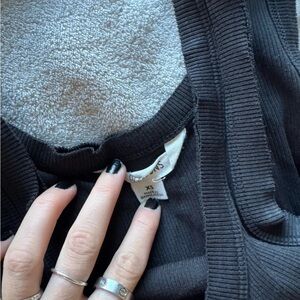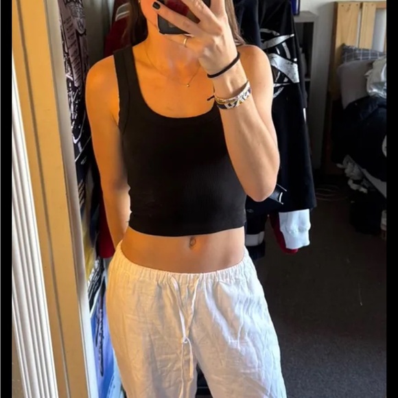 Fitted ribbed crop tank with a scoop neckline. Stretch fabric for a snug, flattering fit. Simple sleeveless silhouette perfect for layering or warm days. Classic black pairs easily with any outfit.