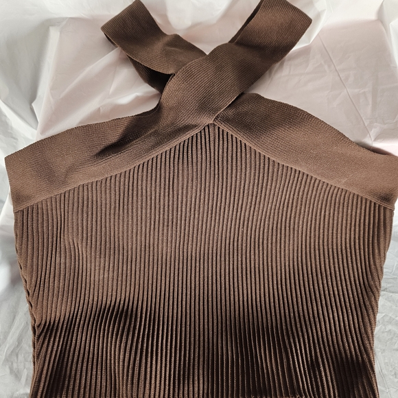 Stylish ribbed crop top. Features a unique cross-strap design. Perfect for casual outings.
