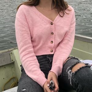 worn a few times, light pink color with buttons in the front! size medium. fit is true to size but it’s definitely short which is why I’m selling (I have a long torso and am 5’10” so should fit more like a normal top on someone else)