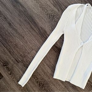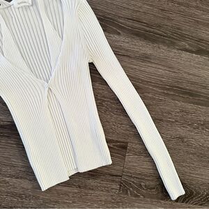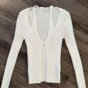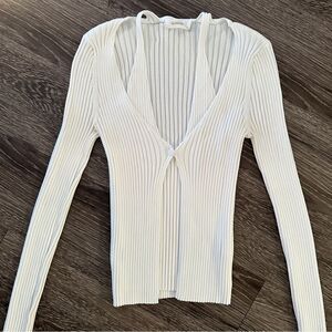 White ribbed cardigan with the double layer making its appearance as a tank underneath