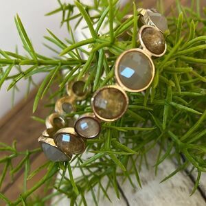 A circular gold colored bracelet with decorative glass stones in shades of brown. Circumference 2 3/4 inches
