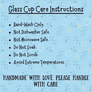 This handmade glass cup holds 16oz of your favorite drink! All glass designs are made with permanent vinyl. Please refer to photos above for product dimensions & glass cup care instructions.