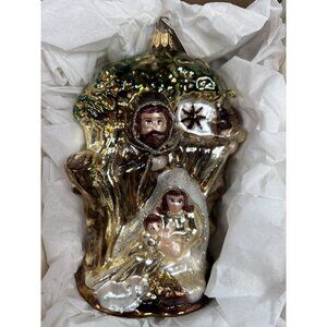 Celebrate the holiday season with this beautiful Nativity Christmas Ornament from Glassware Art Studio. This handmade and hand-blown glass ornament features the Holy Family of Jesus, Mary, and Joseph in a traditional style that will add a decorative touch to your tree. The multicolor design and intricate details make it a perfect addition to any collection of ornaments.