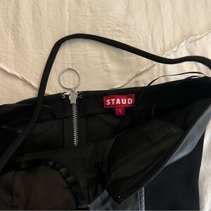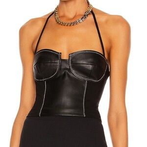 Chic black leather halter top with zipper detail. Ideal for a modern, edgy style.