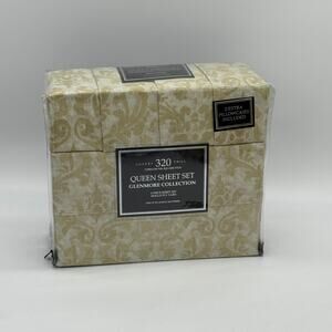 New 6 piece Glenmore Collection Queen Sheet Set. Damask pattern in tan and ivory.