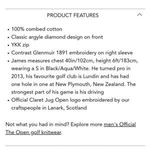 Ideal for stylish golfers, this Glenmuir sweater offers comfort and warmth. Features an eye-catching argyle design with a convenient quarter-zip. YKK Zip, Embroidered Logo Sleeves, St. Andrews Embroidered other sleeve, Retail $152