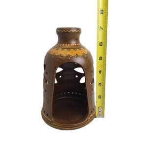 Add a touch of Bohemian charm to your home decor with this beautiful Giraud Berbeit candle holder. The handmade piece is crafted from clay and stoneware materials, making it a unique addition to any room. The antique-style candle holder features a wet look finish and matte texture, with a decorative carved flower design and a convenient handle for easy carrying.