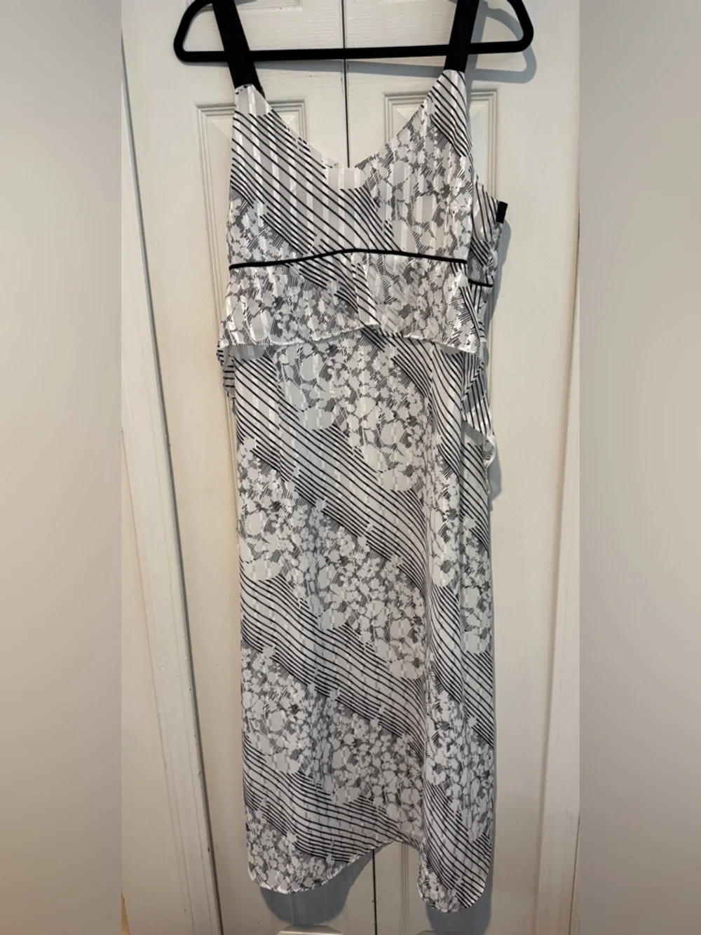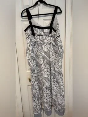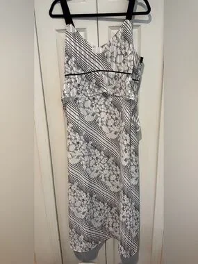 Elegant white mididress with black floral and diagonal stripe pattern. Lightweight layered design offers a flattering, feminine silhouette. Sleeveless style with subtle contrast piping for refined detail. Adjustable straps and back zipper.Perfect for daytime events or evening outings.