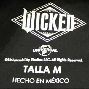This is a black crop top T-shirt featuring Glinda & Elphaba from Wicked, designed by Universal Studios Exclusively for Mexico & not available outside the country.