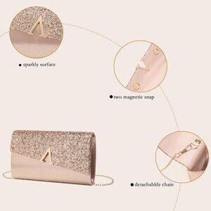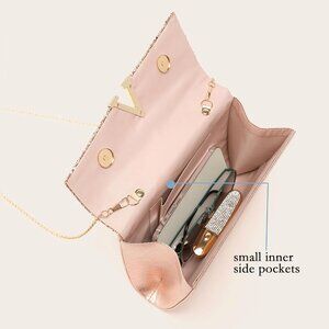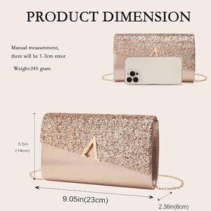Features: Elegant and sparkly polyester clutch with a shimmering surface that truly catches the light. Comes with a removable chain strap for versatile wear—handheld or over-the-shoulder. Magnetic snap closure for easy access. Compact size fits your phone, keys, lipstick, and cards, making it ideal for parties, weddings, or nights out.