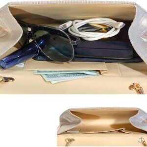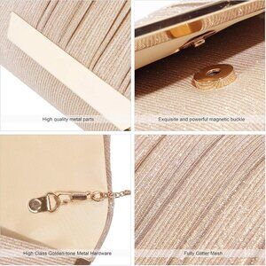 Features: Elegant sparkle mesh with gold metal accents, this clutch has a magnetic snap closure and soft lining. Fits your essentials like makeup, phone, wallet, and keys with ease. Comes with a detachable chain strap, so you can wear it as a clutch, shoulder bag, or crossbody — versatile and stylish!