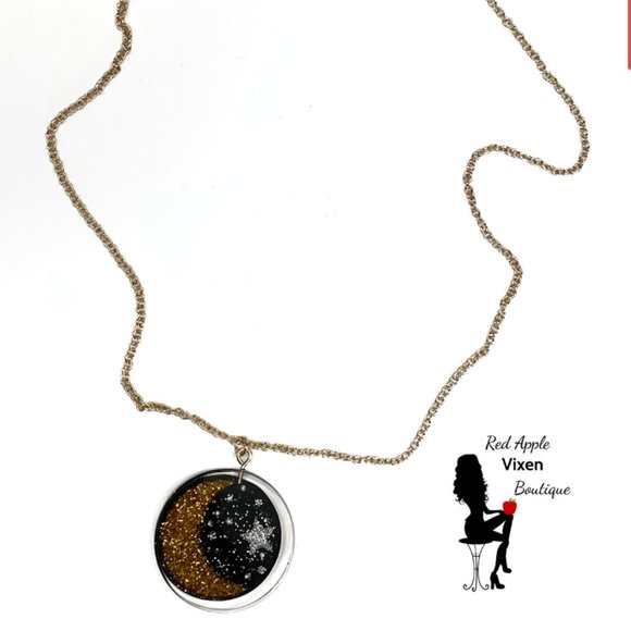 Celebrate celestial style with this crafty glitter moon and stars necklace. Set in a thick clear acrylic pendant, black gold and silver glitter create an artistic night sky design. Wear this glitter moon lit night necklace to shine bright like the stars!