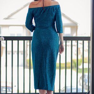 This beautiful off the shoulder dress features a thigh high slit and asymmetrical high low hem. The glitter fabric makes it the perfect party dress! Color is teal, a slight more blue than it is green.