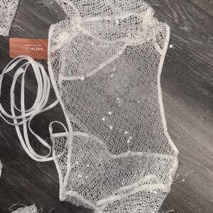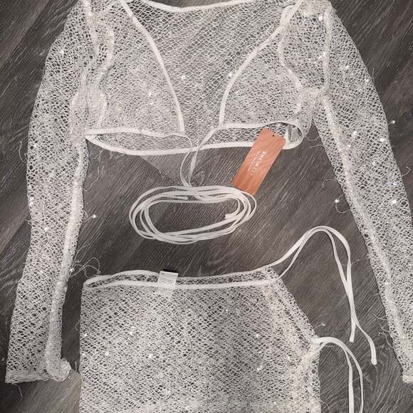 White fishnet long sleeve crop top and matching mini skirt set with glitter and rhinestone details. Perfect for a festival, rave, or a unique night out. This two-piece set offers a daring and fashionable look. New with tags, never worn.