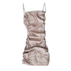 Stunning champagne-toned mini dress with ruched mesh overlay and rhinestone spaghetti straps.