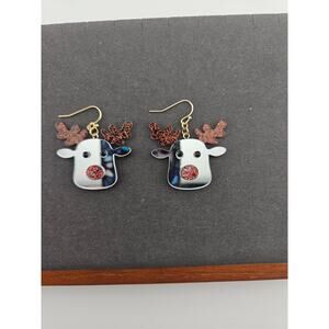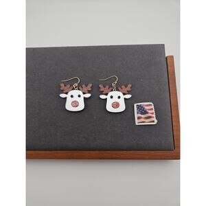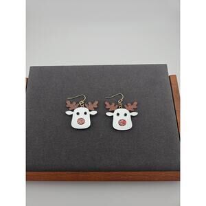 Glitter Silver Tone Mirror Reindeer Earrings Hook Style Dangle Drop Christmas