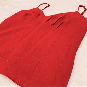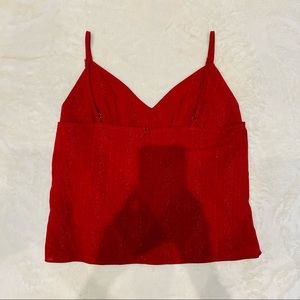 A rich red spaghetti top cami with a pleated bust accent and glitter thread woven into the fabric. Hidden zipper and inside hook closer on the back.