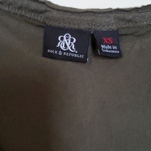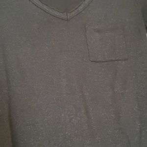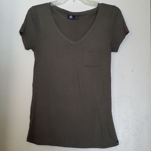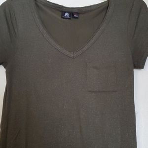 Army green v-neck tshirt with sparkles in the material. Functional front breast pocket