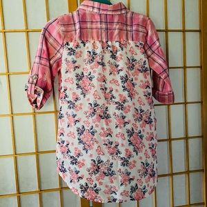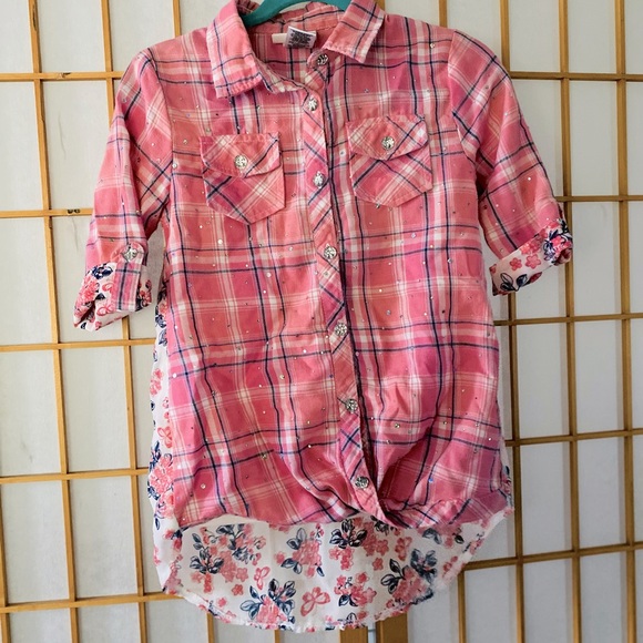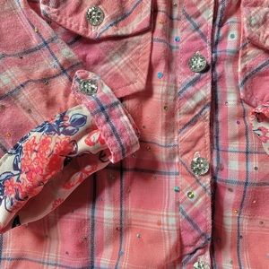 Gently used sparkling pink/floral button down shirt! I have washed this shirt about 4 times and the jewels still stayed on nicely, so very sturdy I may add!