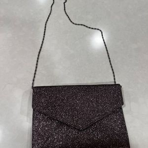 Like new, gently used, gray glitter evening clutch. Measures 10” wide. Small metal chain for shoulder carrying. Brand is Neiman Marcus.